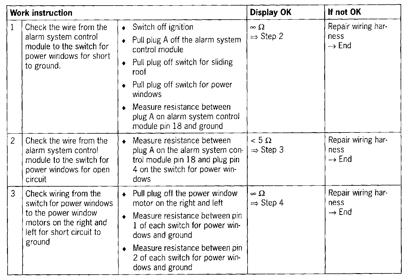 - Short circuit to ground/open circuit between alarm system control module and power window motors