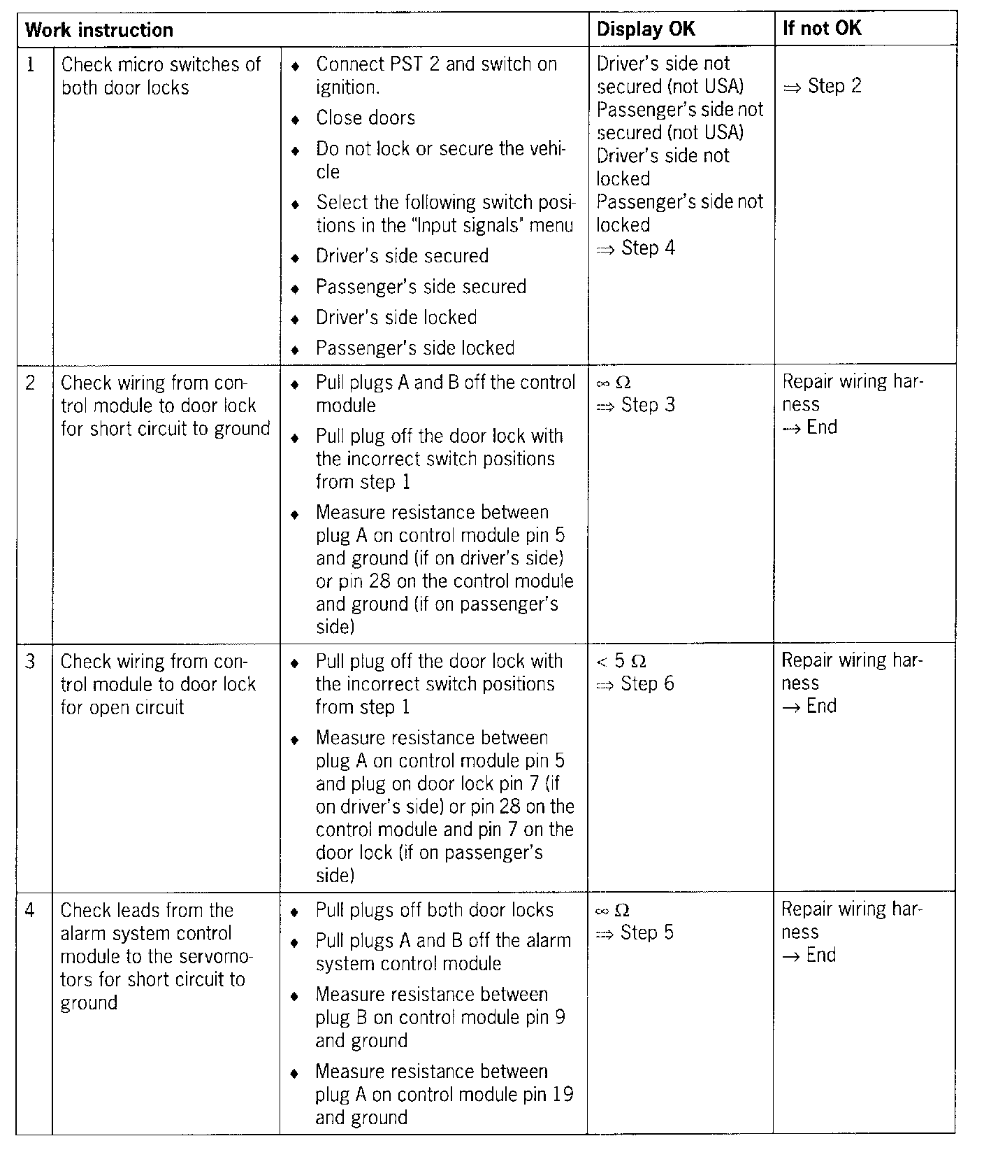 NOTE: During troubleshooting, the micro switches of the door locks are tested in Step 1. The test is to be used only for vehicles with "safe position". USA vehicles do not have a "safe" position; "Driver's door secured" and "Passenger's door secured" are therefore displayed during the "Input signals" test.