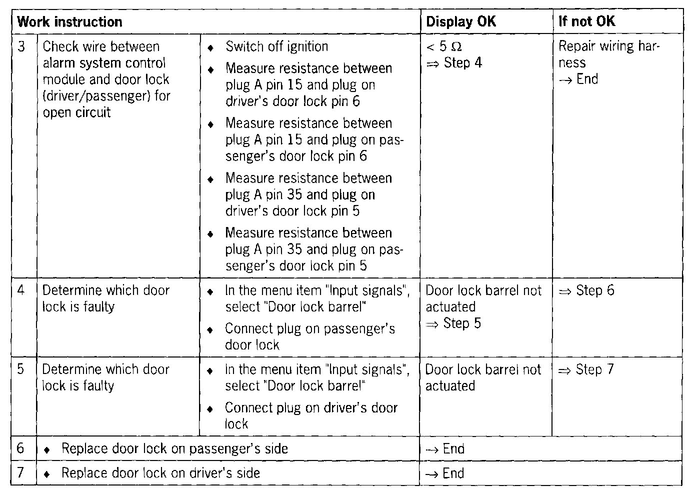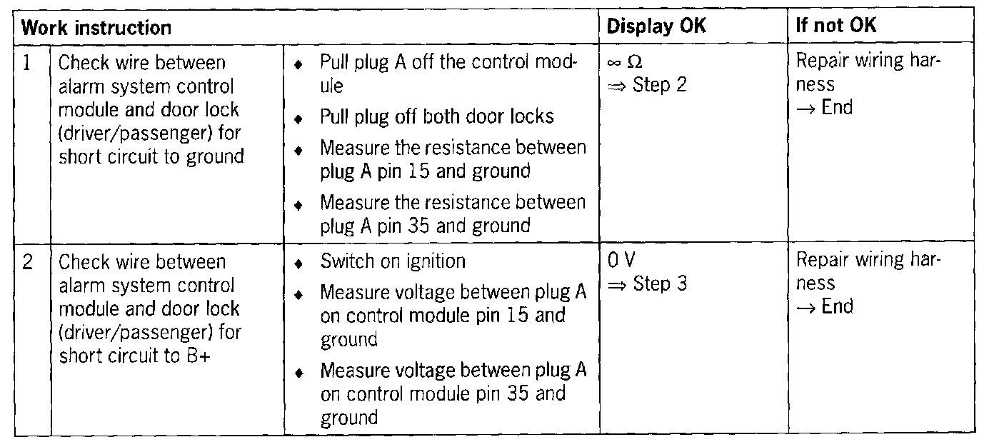 - Short circuit to ground/open circuit in the wiring between the alarm system control module and both door locks