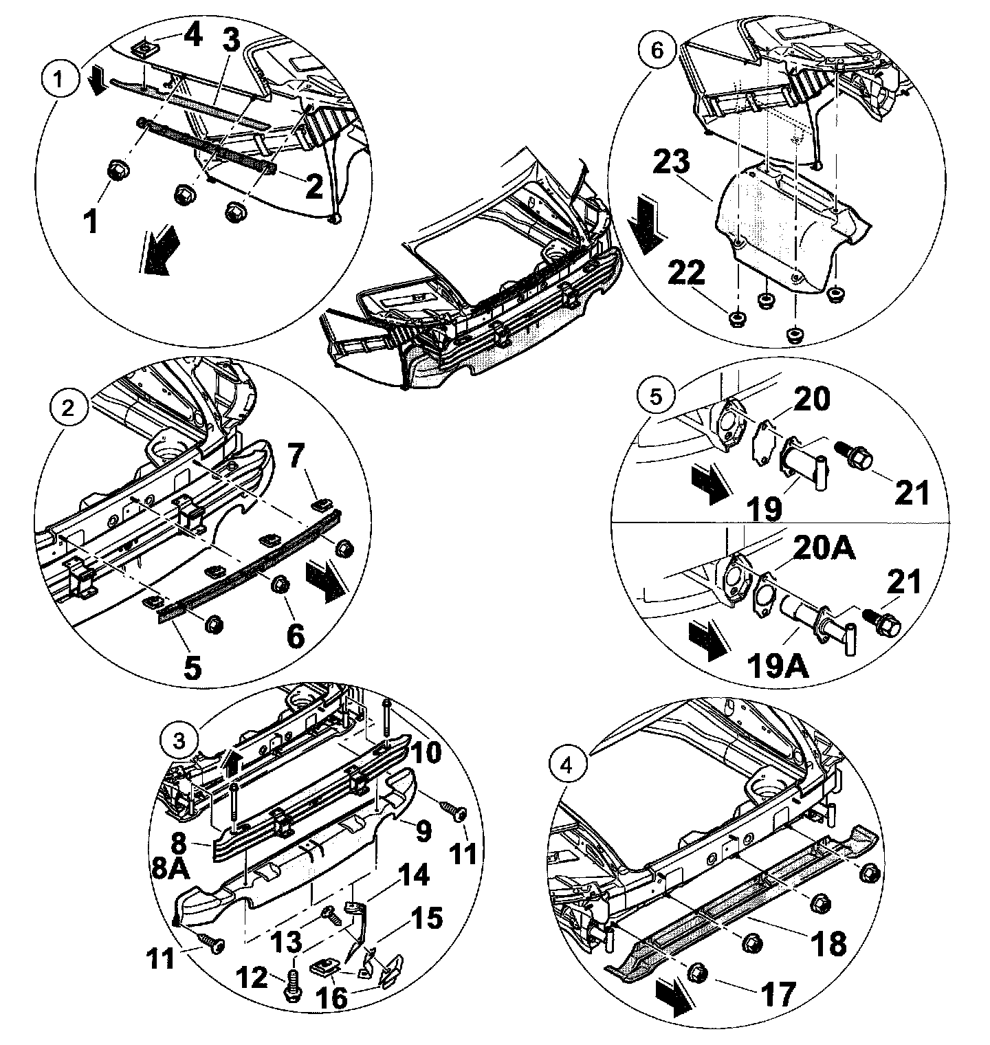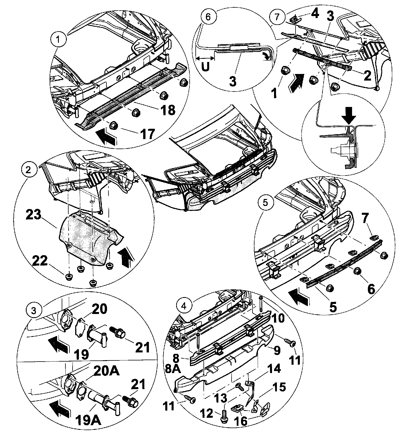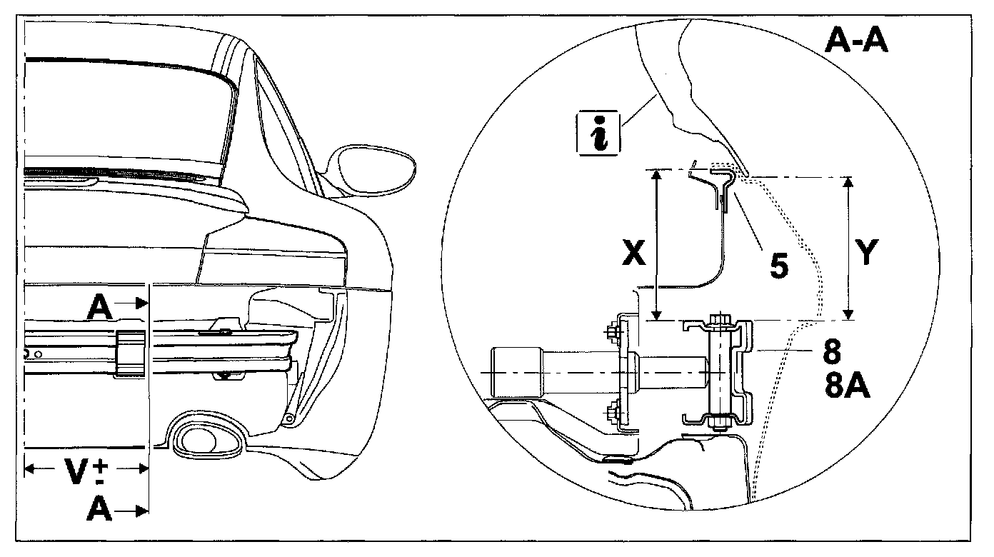 2. Adjust the rear bumper -8, 8A- on both sides to dimension -Y = 140 mm-. The measurements can be changed by undoing or moving the impact pipes or impact absorbers (USA version).