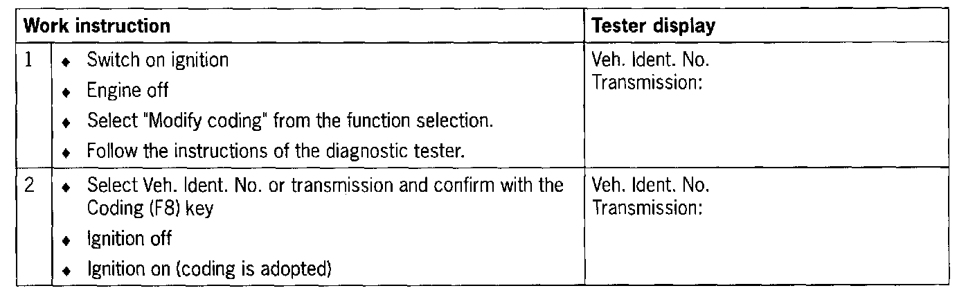 - The control module must be coded for the corresponding type of transmission (manual transmission/Tiptronic).