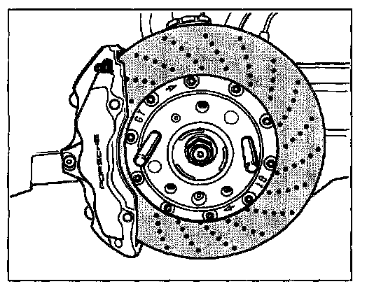 1. To check the brake pads, remove the wheels. Screw the 2 assembly aids (assembly pins), instead of 2 wheel bolts, into the wheel hub before wheel removal-installation. During removal, first remove the 3 remaining wheel bolts and remove the wheel carefully, without touching the brake discs.