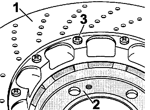 ^ Do not separate the brake-disc chamber -2- and brake disc -1from each other. It is also not permissible and not necessary to turn the screws -3-. The screws are safeguarded against turning by compression in the bushing.