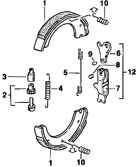 Note: The hook (the curved end of the spring) of compression spring No. -10- must point upward on the upper brake shoe and downward on the lower brake shoe.