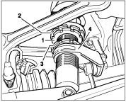The vehicle height on the front and rear axle is adjusted by turning the adjusting nut -No. 2-. The lock nut -No. 1- must first be loosened. Use a hook wrench or special tool 9647 (hook wrench insert) for this purpose.