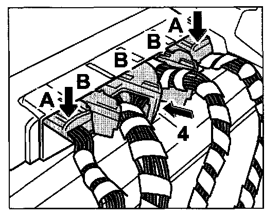 6. Push in connectors -B- locking -arrow- and actuate the latching lever-4-.