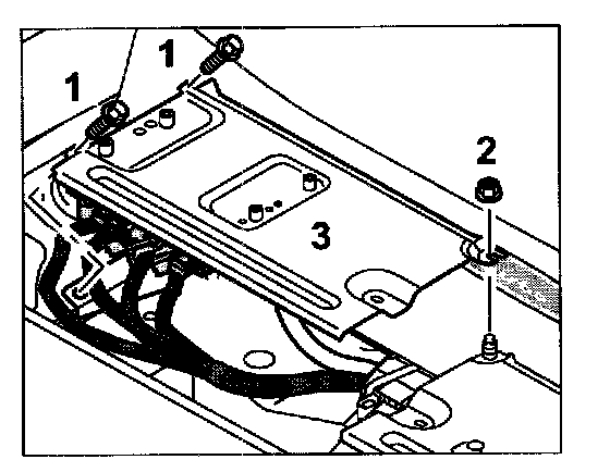 4. Turn the control module holder -3- and push it in under the fastening nut -2-. Tighten both fastening screws -1- and the fastening nut -2-. Tightening Torque: 10 Nm (7.5 ftlb.).