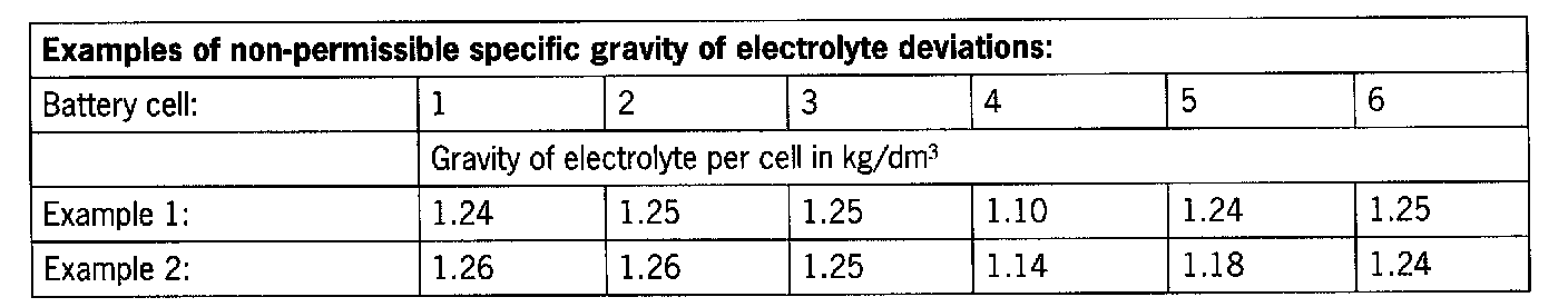 The measuring values for the gravity of electrolyte of the individual battery cells should not deviate by more than 0.03 kg/cu.dm from each other.