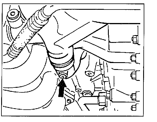 7. Separate the B+ disconnection point -arrow- under the cover for this purpose. Unscrew the left fastening screw. Unscrew the right fastening screw by approx. 1 cm. Then drive it in with gentle taps of a hammer until the screw head makes contact with the generator again. Now unscrew fastening screw completely. Lift the generator upwards out of the engine compartment.
