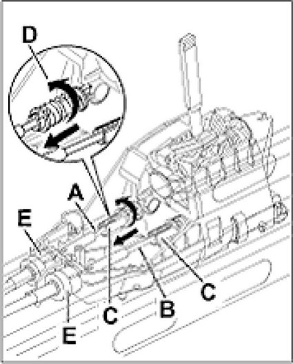 3. Engage the shift cable -B- and selector cable -A- in the open adjusters -C- and close the adjusters. The locking sleeves on the adjuster must move to the end position automatically.