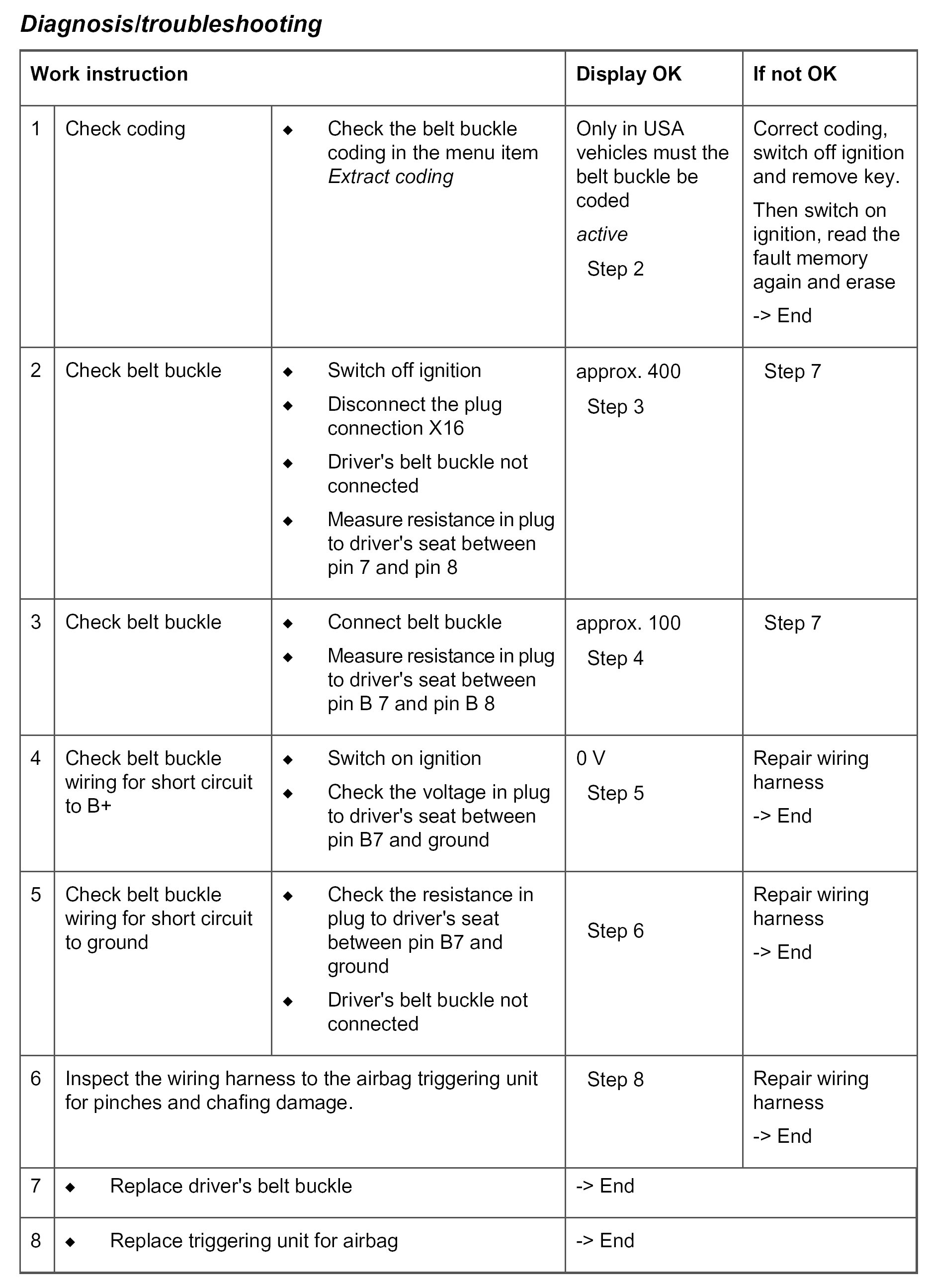 - Short circuit to B+/ground or open circuit in the wiring between the driver's belt buckle and the airbag triggering unit