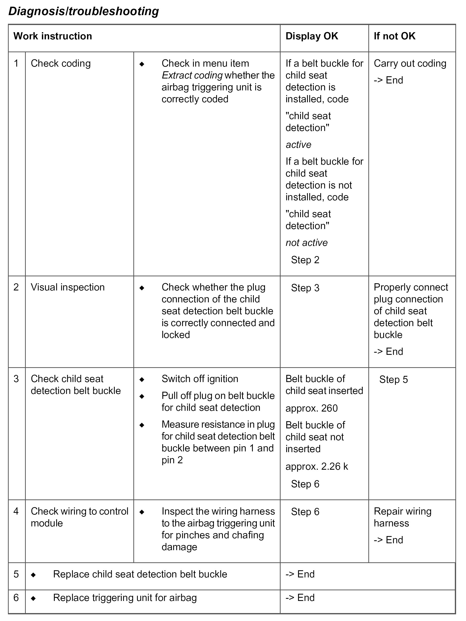 - Short circuit to B+/ground or open circuit in the wiring between the airbag triggering unit and the child seat detection belt buckle