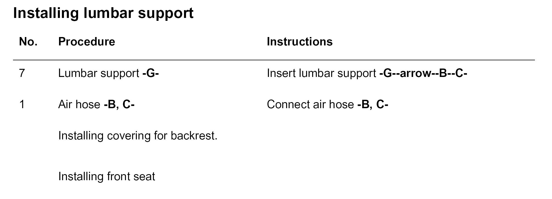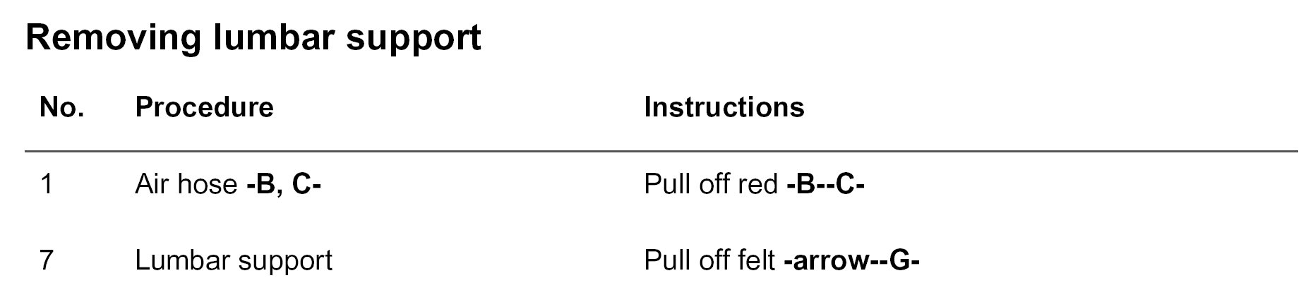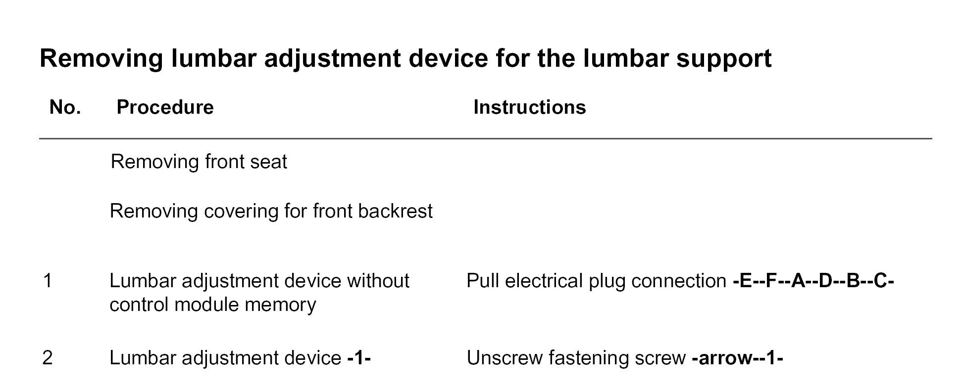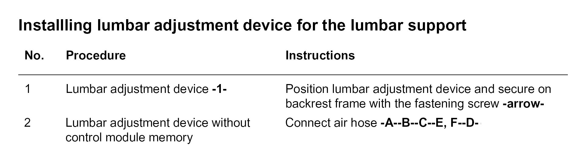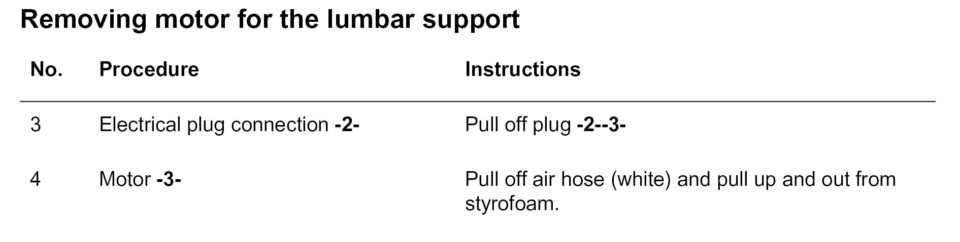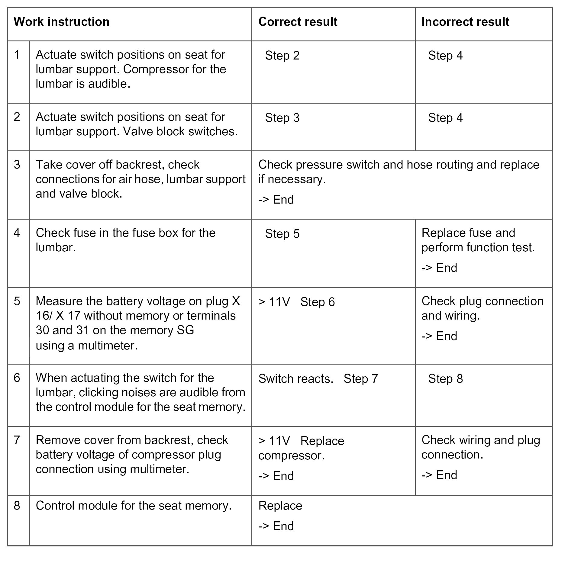 In the case of the complaint "lumbar support does not function", proceed according to the following work instruction. As the seat functions vary, the test plan principally complies with the seat version with seat memory adjustment. Work aids: Use wiring diagram and multimeter.