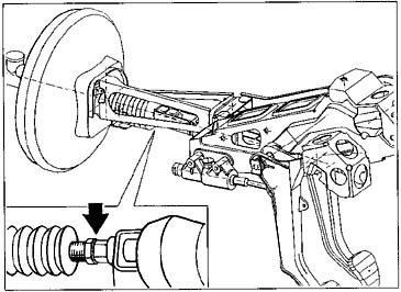 Adjusting the pushrod length changes the position of the brake pedal. To do this, undo the lock nut and turn the pushrod accordingly at the hexagon (arrow).