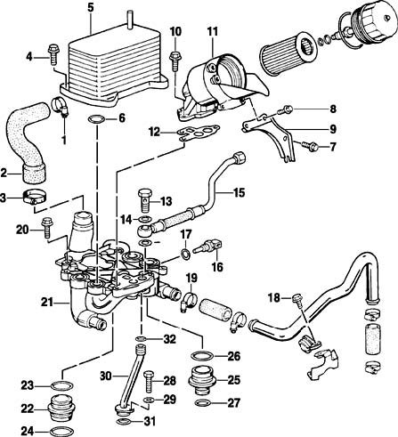 Make sure the four fastening screws on the oil cooler bracket are used correctly. See legend No. 20. Only hexagon-head screws with the Part No. 900 075 341 02 may be used. These can be recognized from their captive washer and yellow chromated screw.