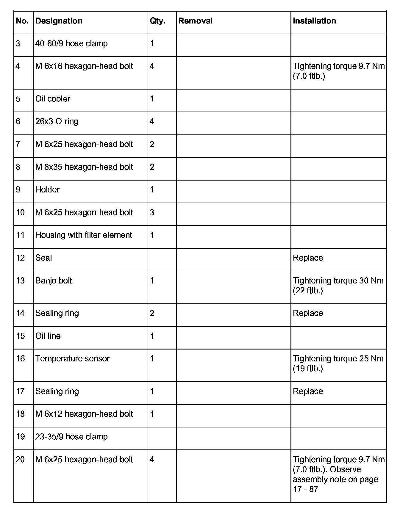Screw in the four oil cooler fastening screws and tighten to 9.7 Nm (7.0 ft. lbs.).