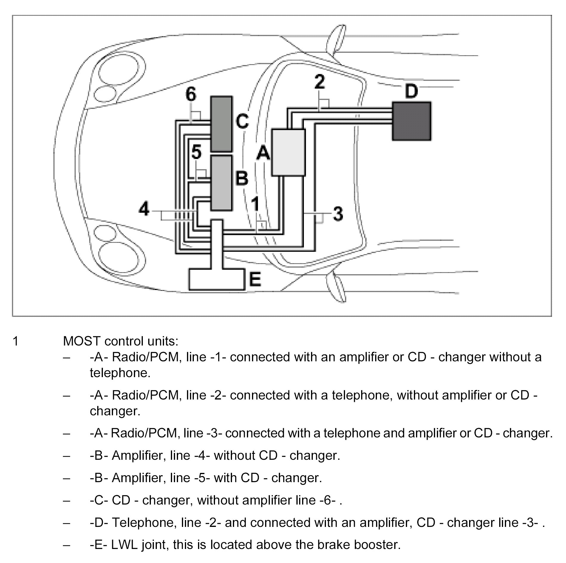 The graphic clarifies the cabling of the individual MOST control units which vary according to their equipment.