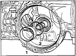 4. Take bearing outer race (1) and adjusting shim (2) out of the transmission housing by hand.