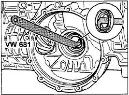 ^ Special tool VW 681 must be applied behind the two sealing lips of the sealing ring. Do not apply to the outer circumference of the sealing ring, since otherwise the contact area in the transmission housing will be damaged. While levering it out, guide lever carefully.