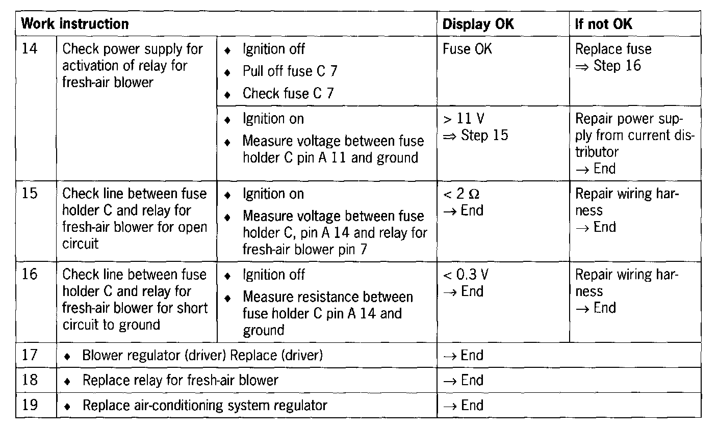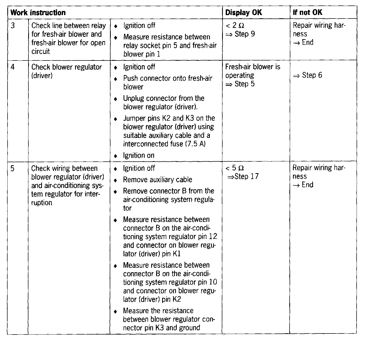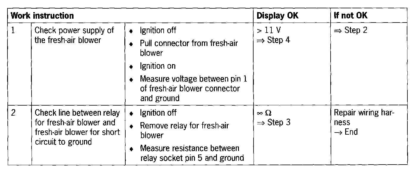 - Fault in the lines between relay for fresh-air blower or blower regulator (end setting) and fresh-air blower.