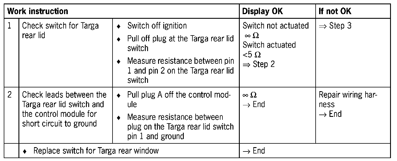 - The fault code is stored if the switch for the "lid for the Targa sliding roof" is actuated for longer than 30 sec. in the direction open or close (e.g. if the contact jams).
