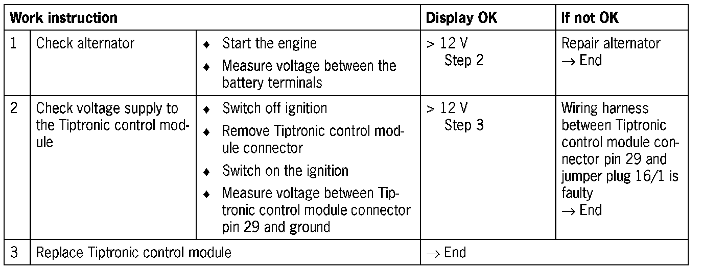 - Tiptronic voltage supply to pin 29 less then 8.5 V or greater then 16.9 V