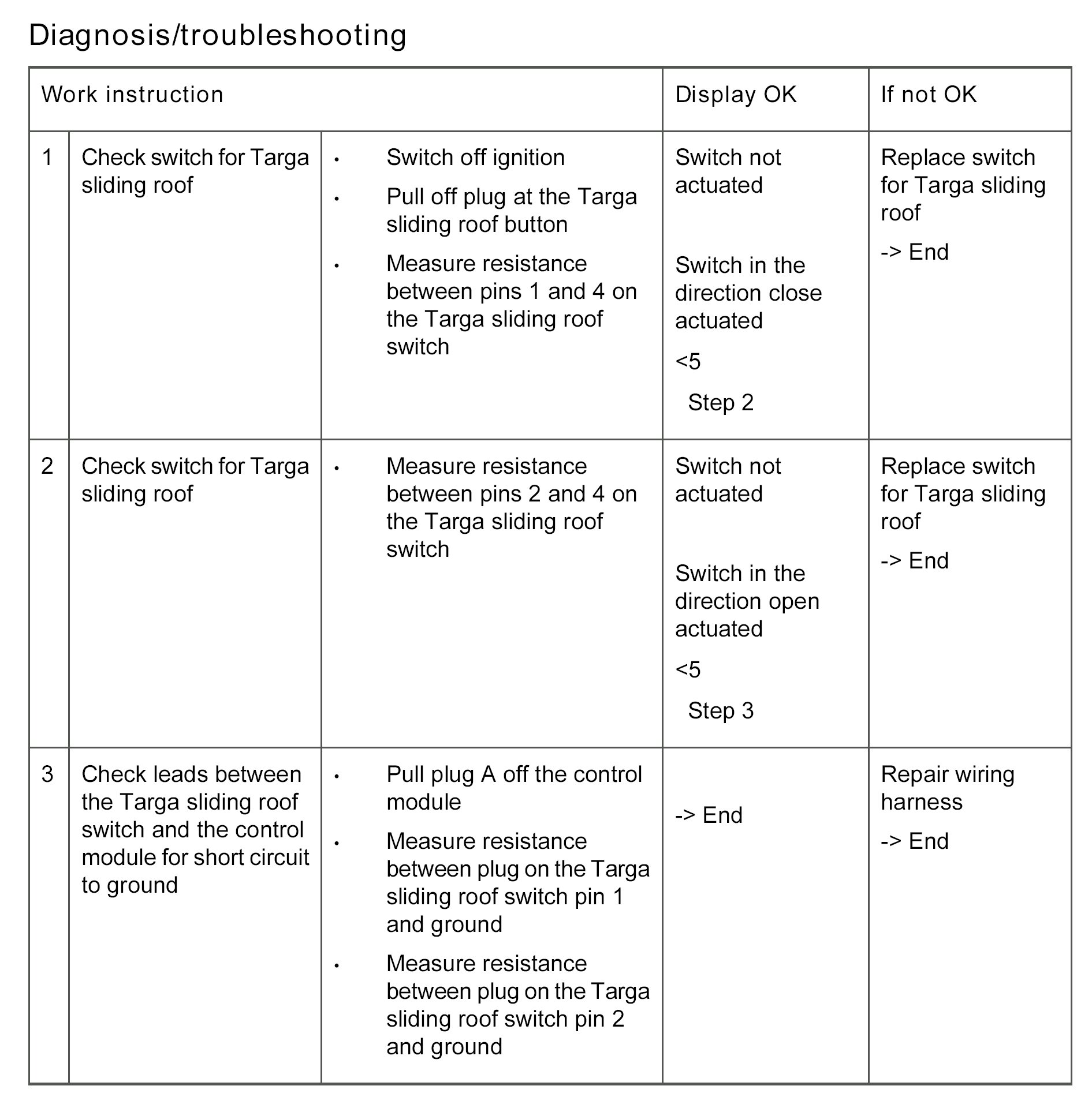 - Short to ground in the leads between the Targa sliding roof button and the control module