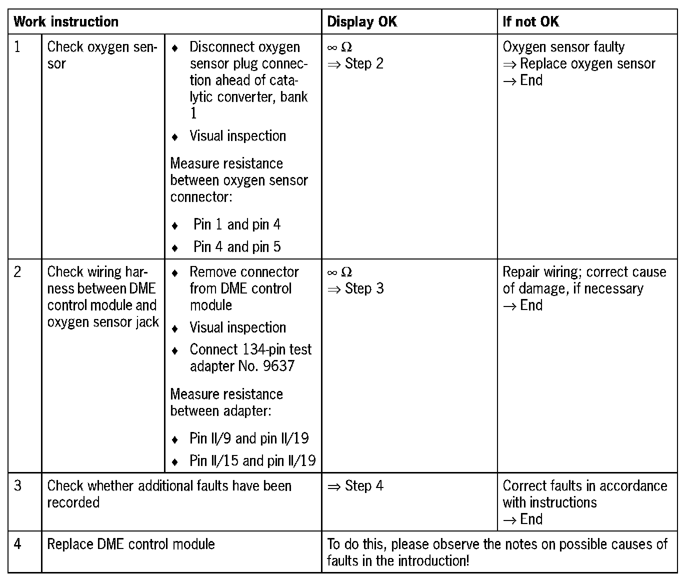 DME control module connector II, pin 9 and oxygen sensor connector after catalytic converter, bank 1, pin 5