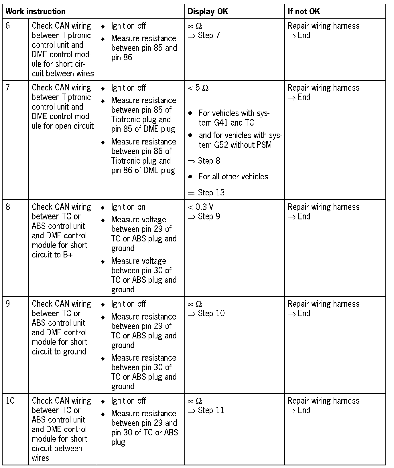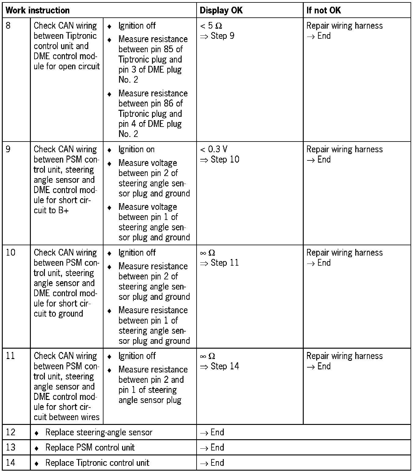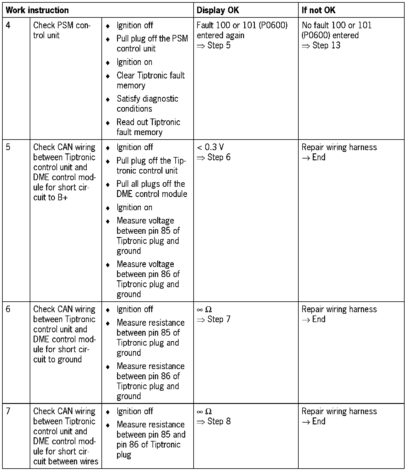 NOTE: For some test steps, the diagnosis conditions will not entirely be satisfied. Switching on the ignition is then sufficient. However, it may be that not all the fault codes listed appear.