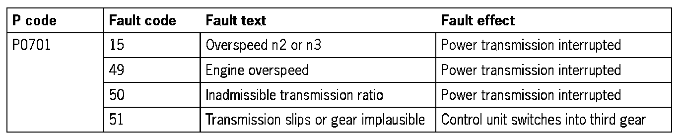NOTE: The fault codes stored in the Tiptronic control unit for this P code are to be taken from the following table.