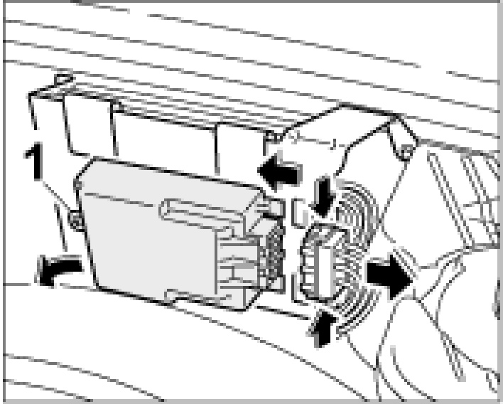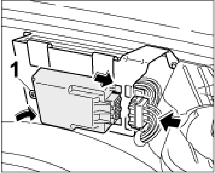 1. Open the luggage-compartment lid and if present, detach the additional amplifier on the clip -1- and detach the additional amplifier (in the direction of travel) to the right.