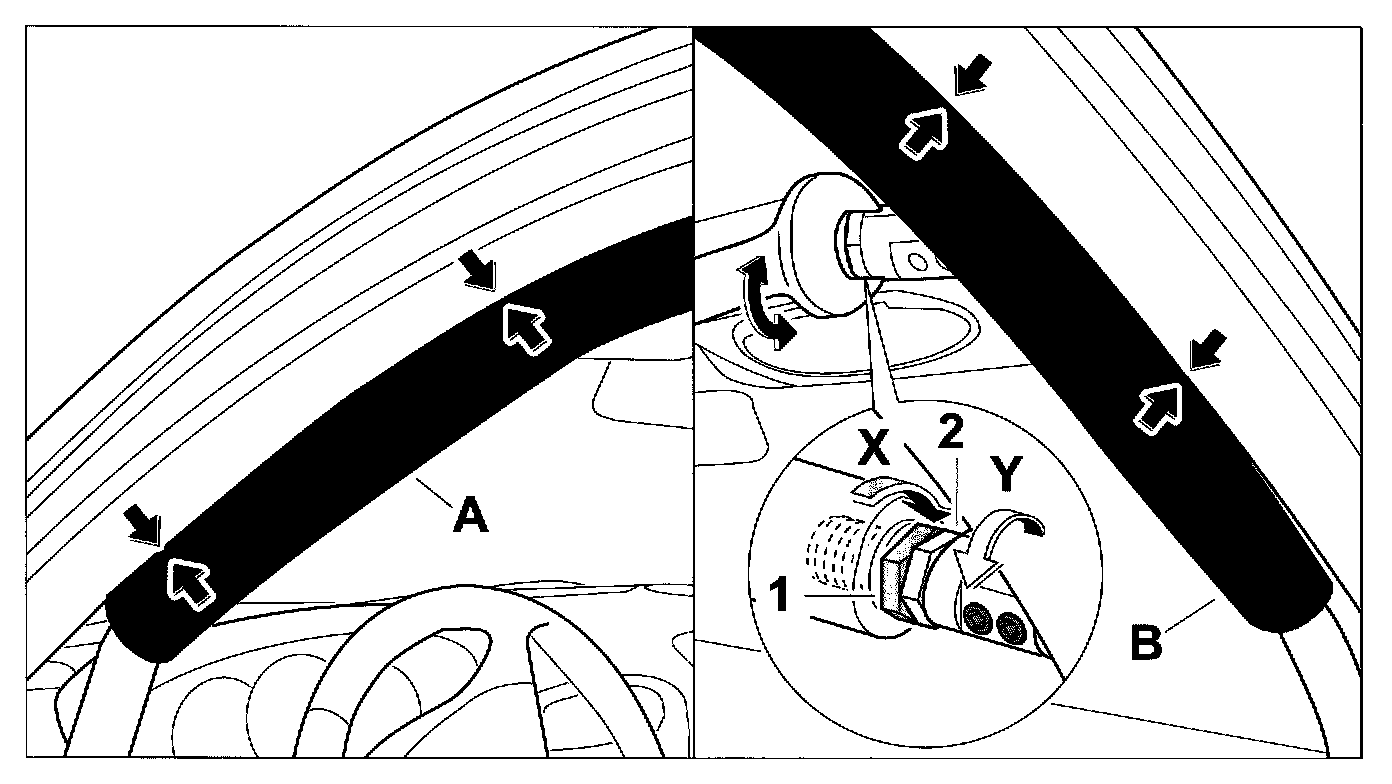 1. Unscrew the adjusting element -2- in the direction of the arrow -Y- until the foam coating of the A-pillar support sections on the left and right -A, B- are pressed against the cowl panel frame trim.