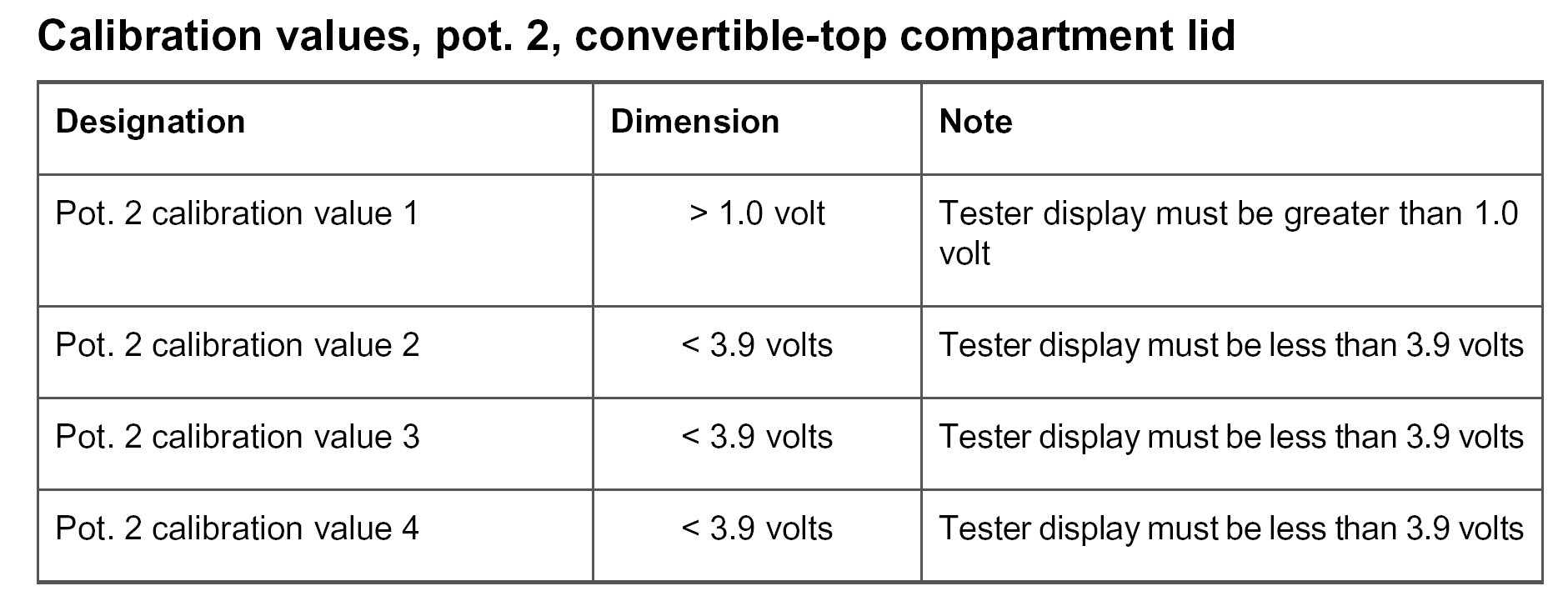 The values between pot. 2, calibration value 1, and pot. 2, calibration value 4, are calculated as percentage by the convertible-top control unit.