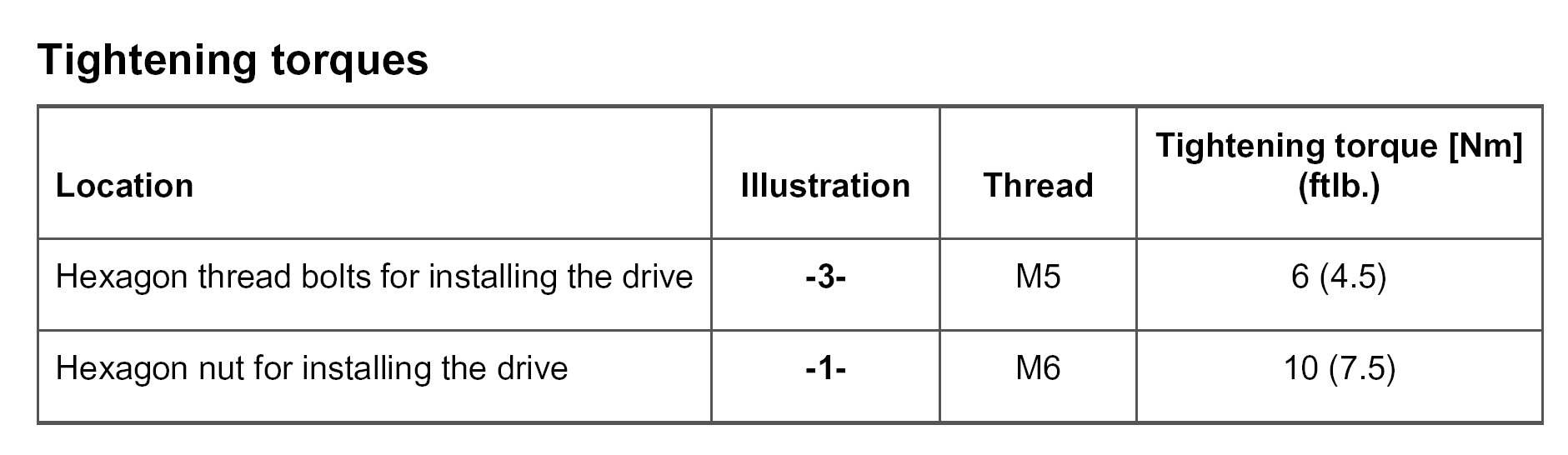 Install potentiometer and motor. Tightening torque for hexagon thread bolts -3- 6 Nm (4.5 ftlb.). Fastening nuts -1- 10 Nm (7.5 ftlb.).