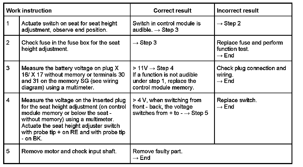 In the case of the complaint "seat height adjustment does not function", proceed according to test plan. As the seat functions vary, the test plan complies with the seat version with seat memory adjustment. Work aids: Use wiring diagram and multimeter.