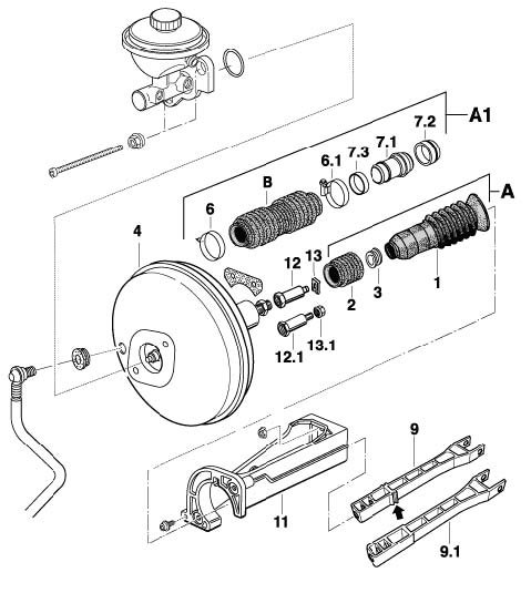 ^ To convert the bellows variant -A- to version -A1-, the hydraulic unit, the brake booster -4- with brake master cylinder and the intermediate piece -11- must be removed.