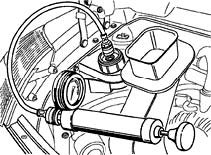 2. Pump the cooling system up to an excess pressure of 1.3 bar. If the pressure decreases, locate the leak and remedy the fault. Check pressure relief valve(s) in the cap. Screw the tester, adapter and cap together.