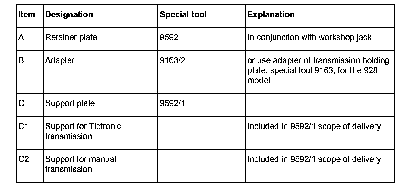 26. Prepare retainer plate (A) - special tool 9592 - for the removal operation. Place adapter (B) 9163/2 on the area of the support plate (C) 9592/1 that is identified "996" and screw the adapter together with the retaining plate 9592 (A). Screw support (D) together with the support plate.