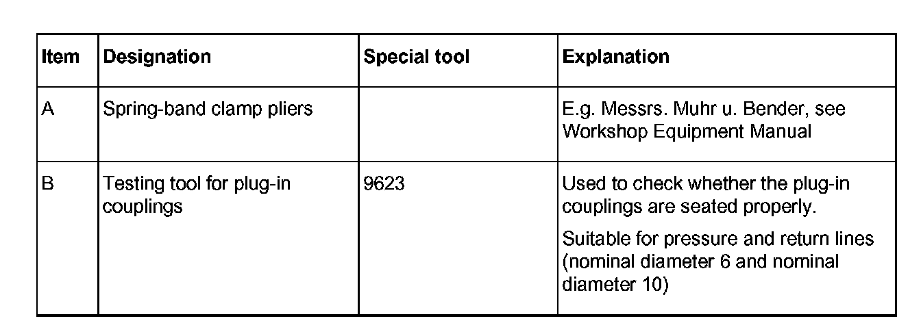 b. Use special tool 9263 to check whether the plug-in coupling was engaged properly. Insert special tool 9263 into the groove (arrow) and apply slight pressure on the special tool to check whether the connection is securely locked (holder is seated properly). The plug must not slide out. If the special tool cannot be inserted in the groove of the plug, shift the plug in the plug-in coupling (pull on plug without using excess force).