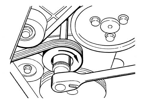 c. Remove drive belt. Mark belt travel direction with a colored pen. Slacken belt by turning the tensioning pulley (wrench size 24 mm) clockwise , hold still and simultaneously take the belt off the drive pulleys.