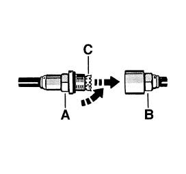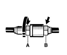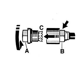 c. Close holder C. Screw threaded part A with fitted holder C into plug-in coupling B and tighten. Counter when tightening. Tightening torque of the steering pressure line (wrench size 15) 30 Nm (22 ft. lbs.). Tightening torque of the steering return line (wrench size 19) 40 Nm (30 ft. lbs.).
