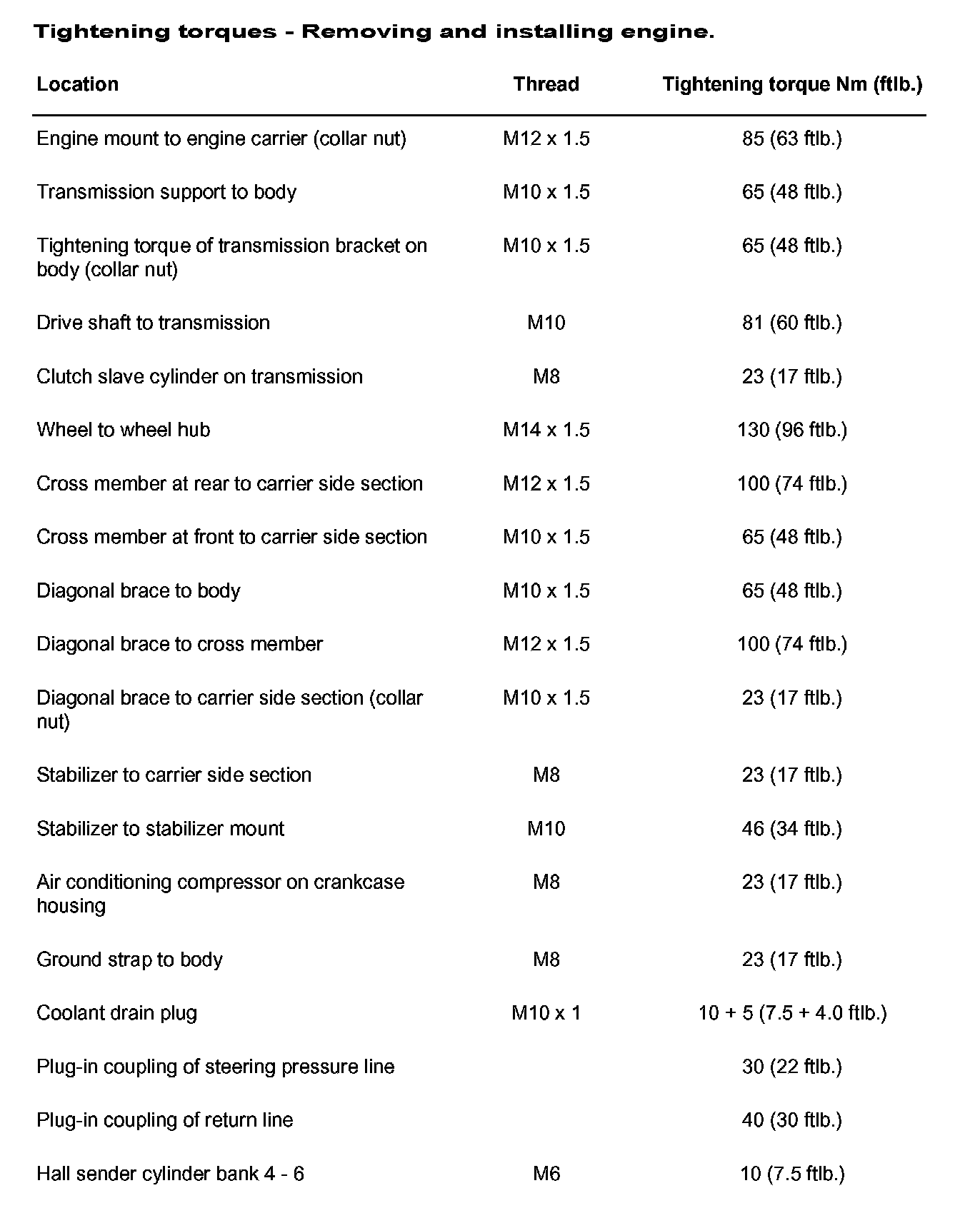 Tightening torque of engine mount to engine carrier : 85 Nm (63 ft. lbs.)