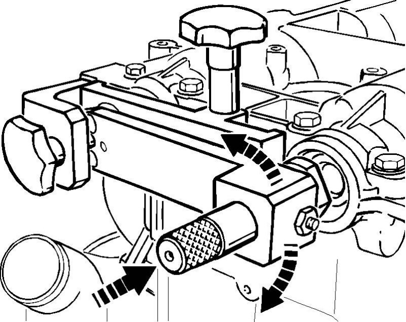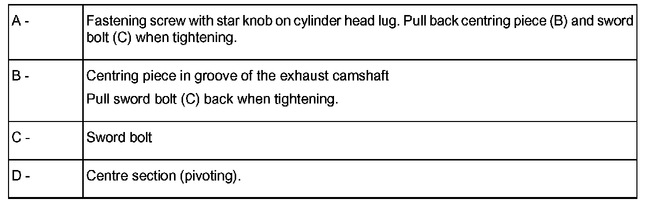9. Allocate camshafts; to do this, turn the pre-tensioned centre piece (D) accordingly until the sword bolt (C) can be fixed in the bearing bore of the inlet camshaft.