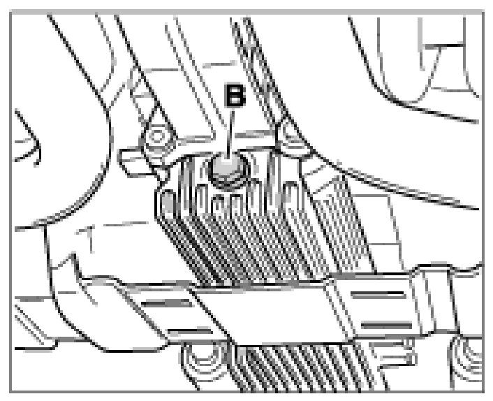 4. Unscrew oil filler screw -B- and drain transmission oil.