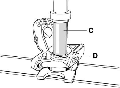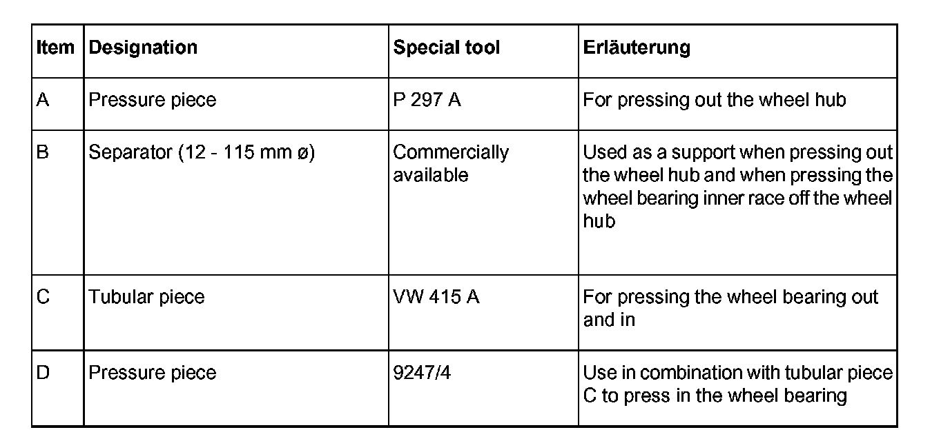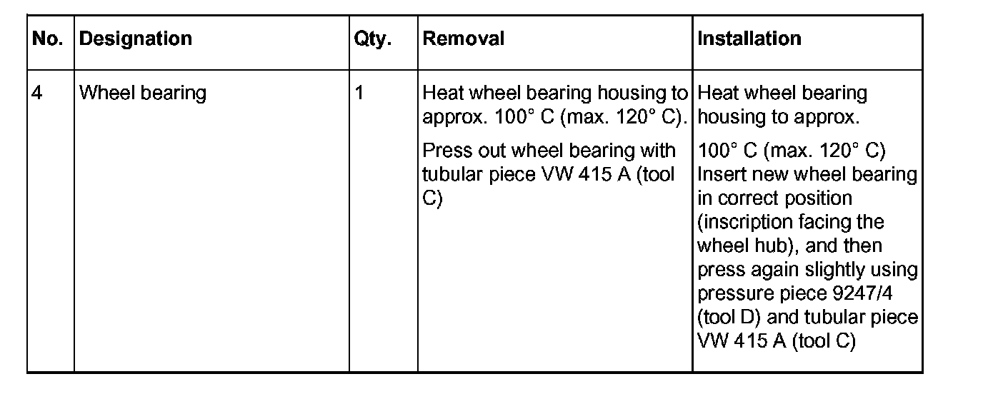 - Heat wheel bearing housing to approximately 100°C (maximum 120°C). Insert new wheel bearing, and then press again slightly using pressure piece 9247/4 (tool D) and tubular piece VW 415 A (tool C).