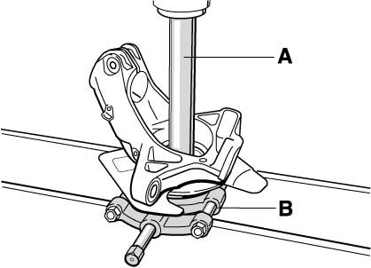 - Press out wheel hub with pressure piece P 297 A (tool A). Use the separator (tool B) for support. If there is not enough space for the wheel hub between the press, appropriate shims will additionally be necessary.