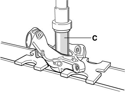 - Heat wheel bearing housing to approximately 100°C (maximum 120°C). Press out wheel bearing with tubular piece VW 415 A (tool C).