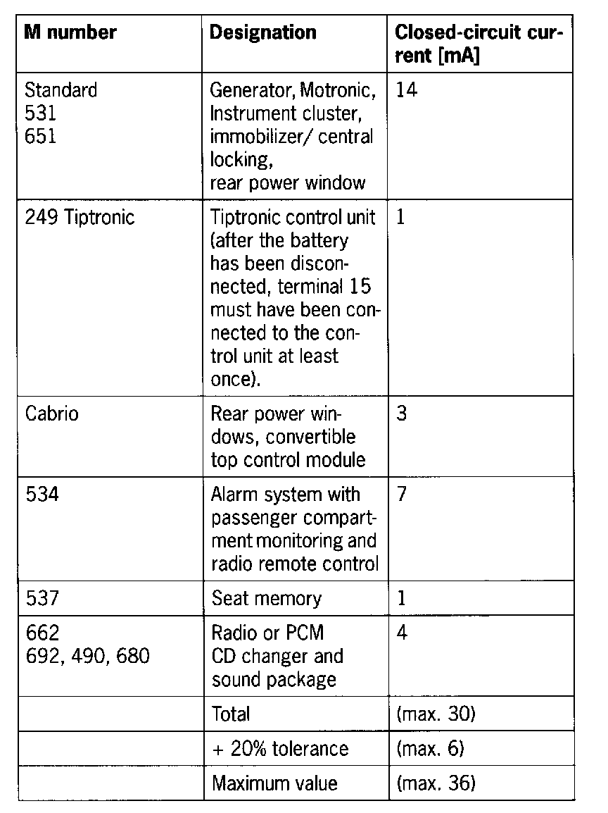 NOTE: Before measuring the closed-circuit current, determine the vehicle equipment (M-number, I-number) and establish the expected closed-circuit current with the aid of the attached table.