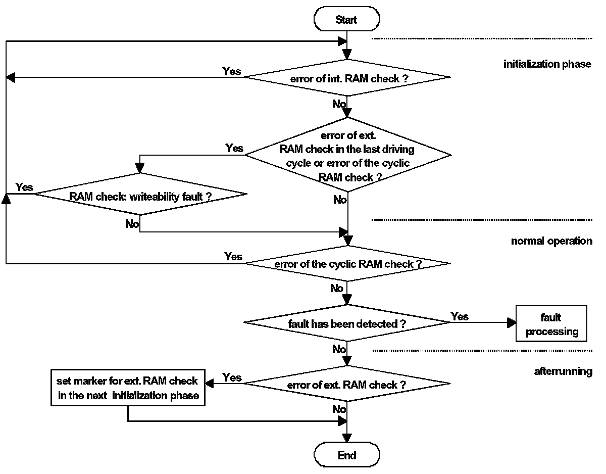 The RAM check is performed once per driving cycle, one part in the initialization phase and the other part in the after running. In case of a detected fault in the after running, this part of the RAM check is repeated in the initialization phase of the following driving cycle. A detected fault in the initialization phase causes a RESET with no function running. Only a no-fault detection in the initialization phase will lead to a normal function and storing the ROM - fault.