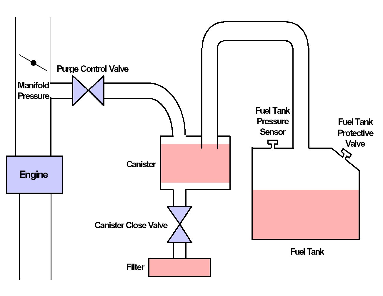The system monitoring is performed by observing the fuel tank. A canister close valve (AAV) and a purge control valve (TEV) are used to open and close the system.